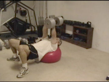 When doing dumbell presses (either on the ball or the bench), tilt the dumbells down and in…if the dumbells were pitchers or water, it would look like you’re pouring them on yourself.